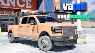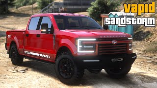 Introducing the remarkable Vapid Sandstorm, a truck that draws its inspiration primarily from the Ford F250 while incorporating distinctive design elements reminiscent of the Chevy 2500.
